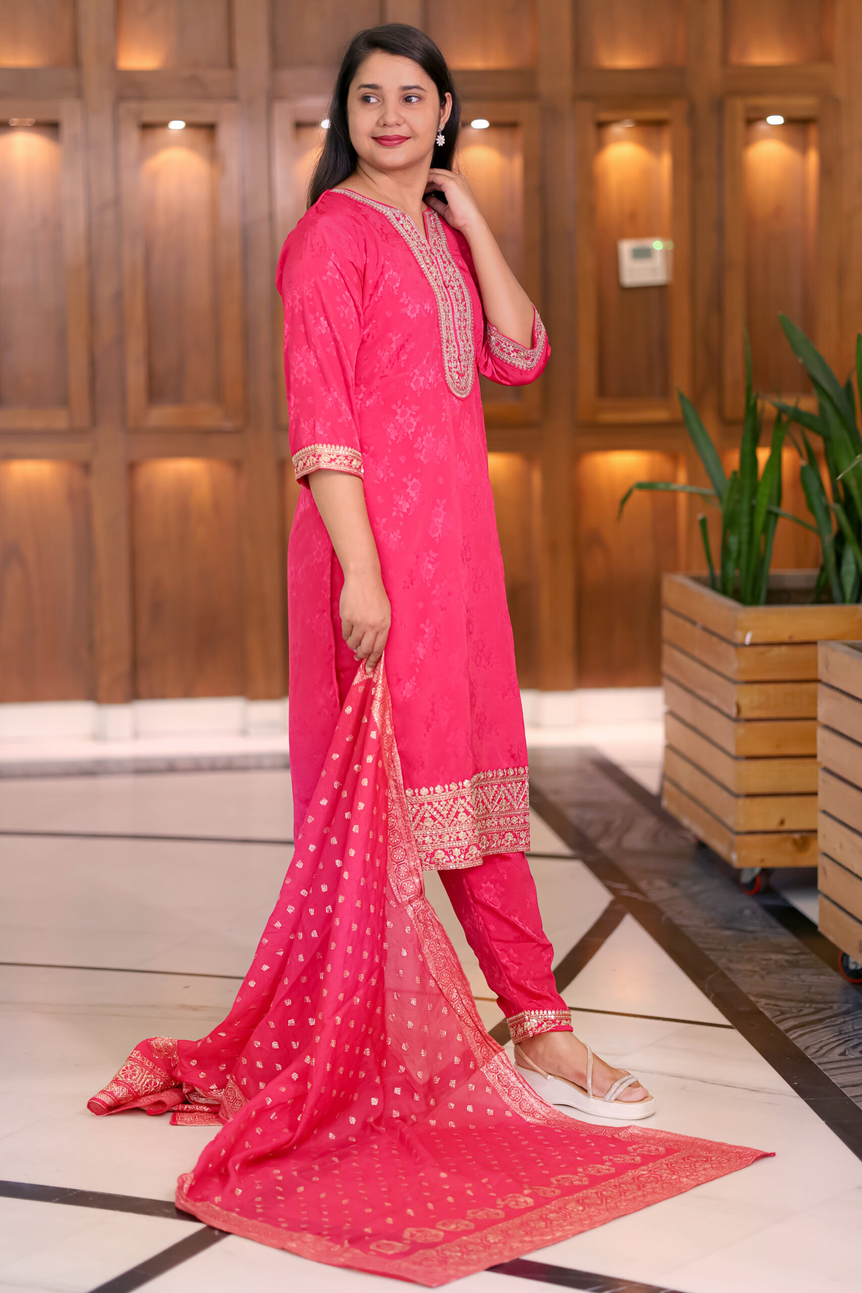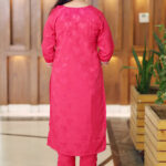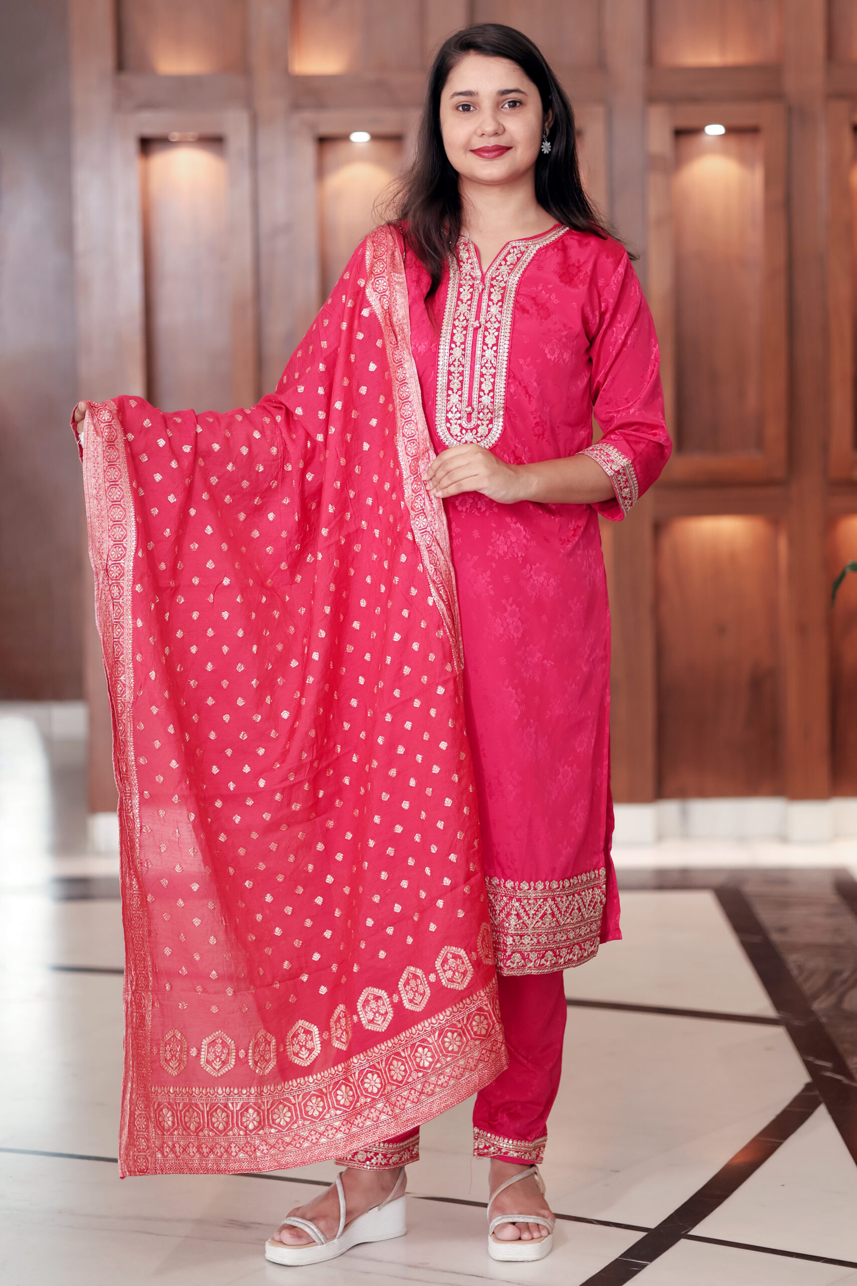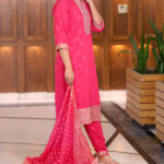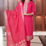 Crafted from premium quality cotton fabric, this three-piece set features a beautifully embroidered straight-cut kurta, a matching bottom, and a lightweight chiffon dupatta adorned with intricate zari and threadwork.