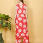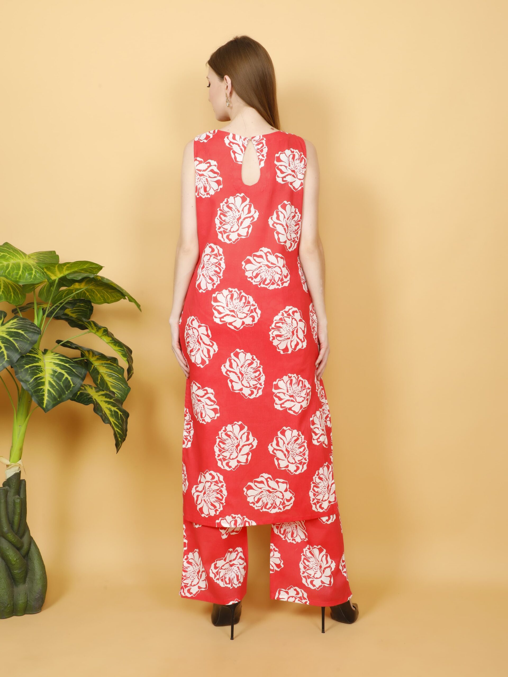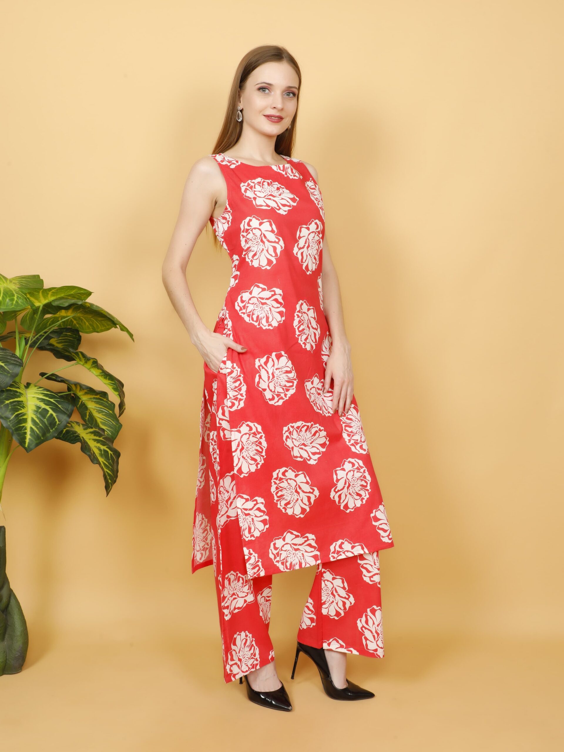 Step into effortless elegance with this stunning red cotton kurta set featuring bold white floral prints. Crafted for comfort and style, this sleeveless kurta comes with side pockets for added functionality and is paired with matching wide-leg pants for a modern ethnic look