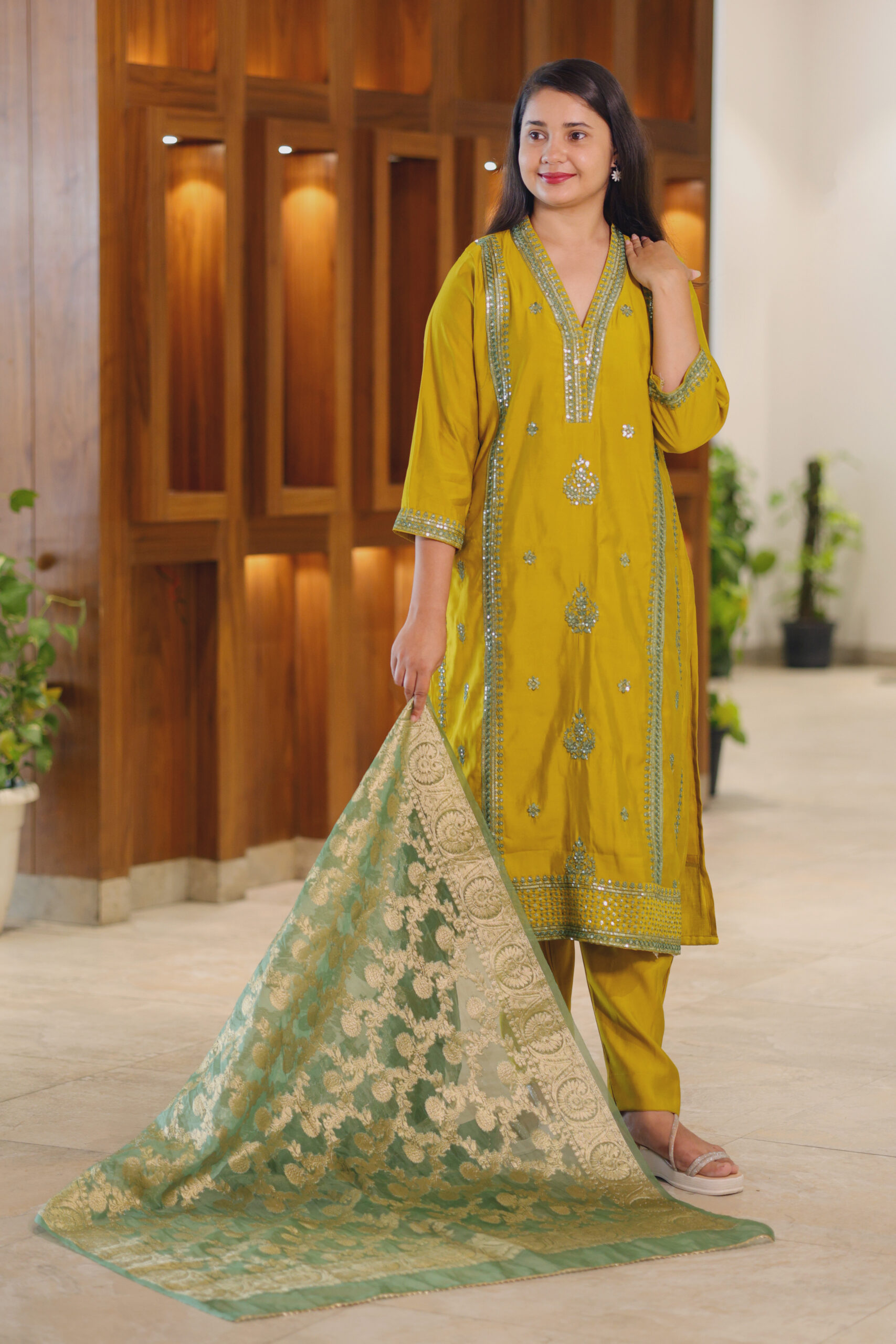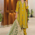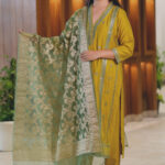 Make a lasting impression with this graceful mustard green silk suit set, featuring intricate embroidery and a rich brocade dupatta. . Whether you’re attending a festive gathering or a family function, this ensemble is designed to dazzle with grace and charm.