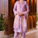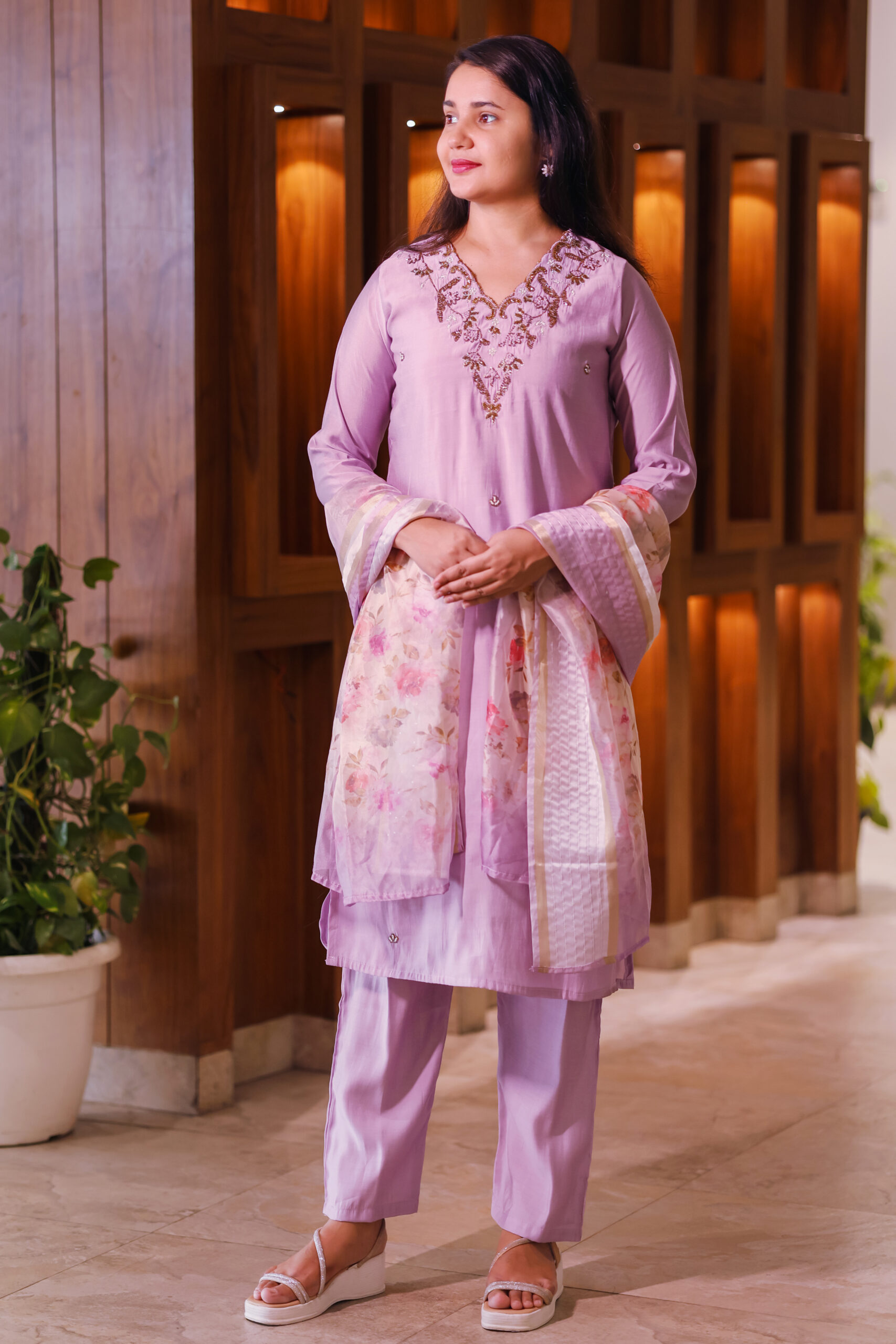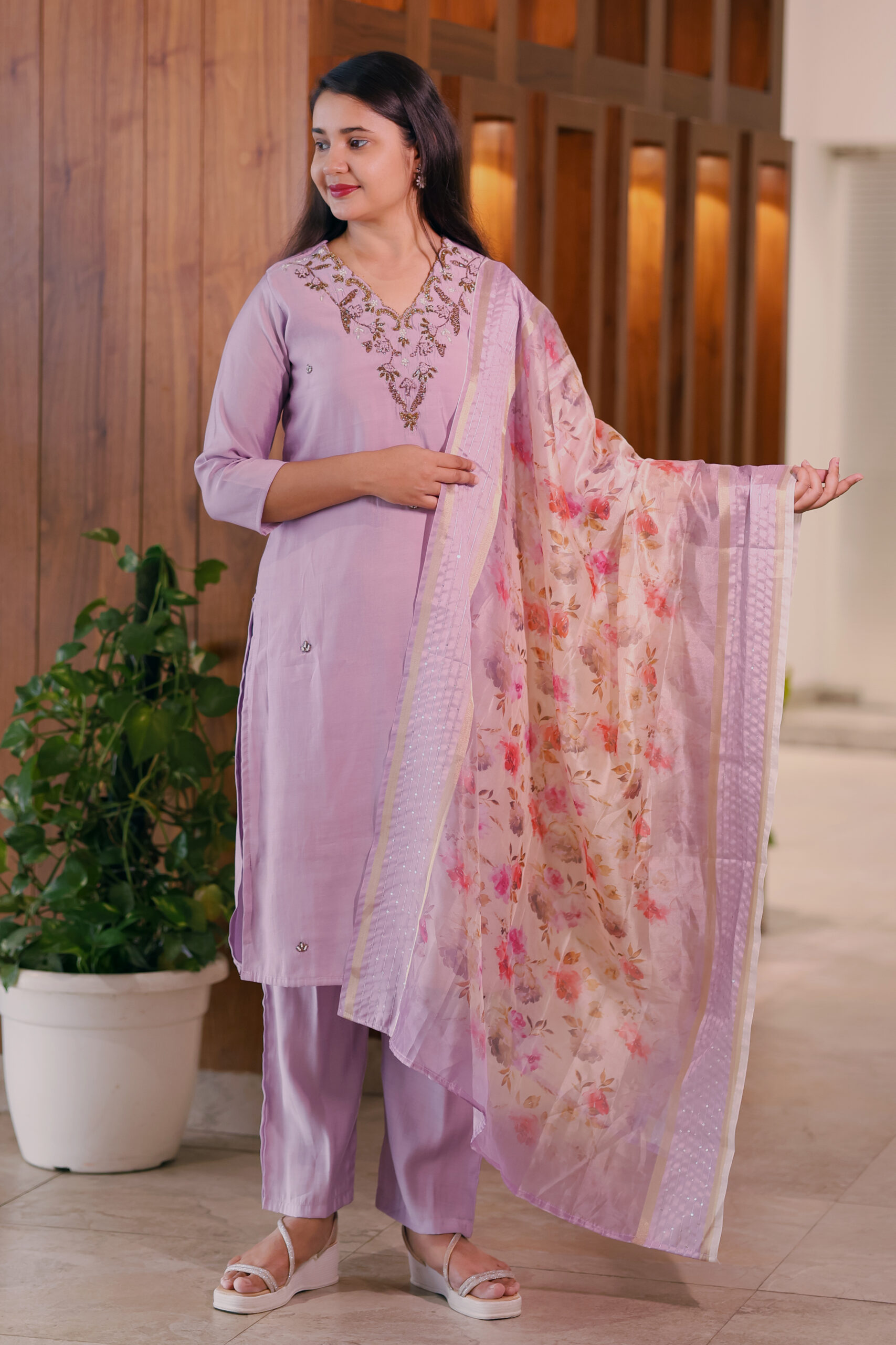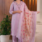 Paired with straight-fit pants and a stunning organza dupatta adorned with vibrant floral prints and lace borders, this ensemble is ideal for festive brunches, day weddings, or elegant gatherings.