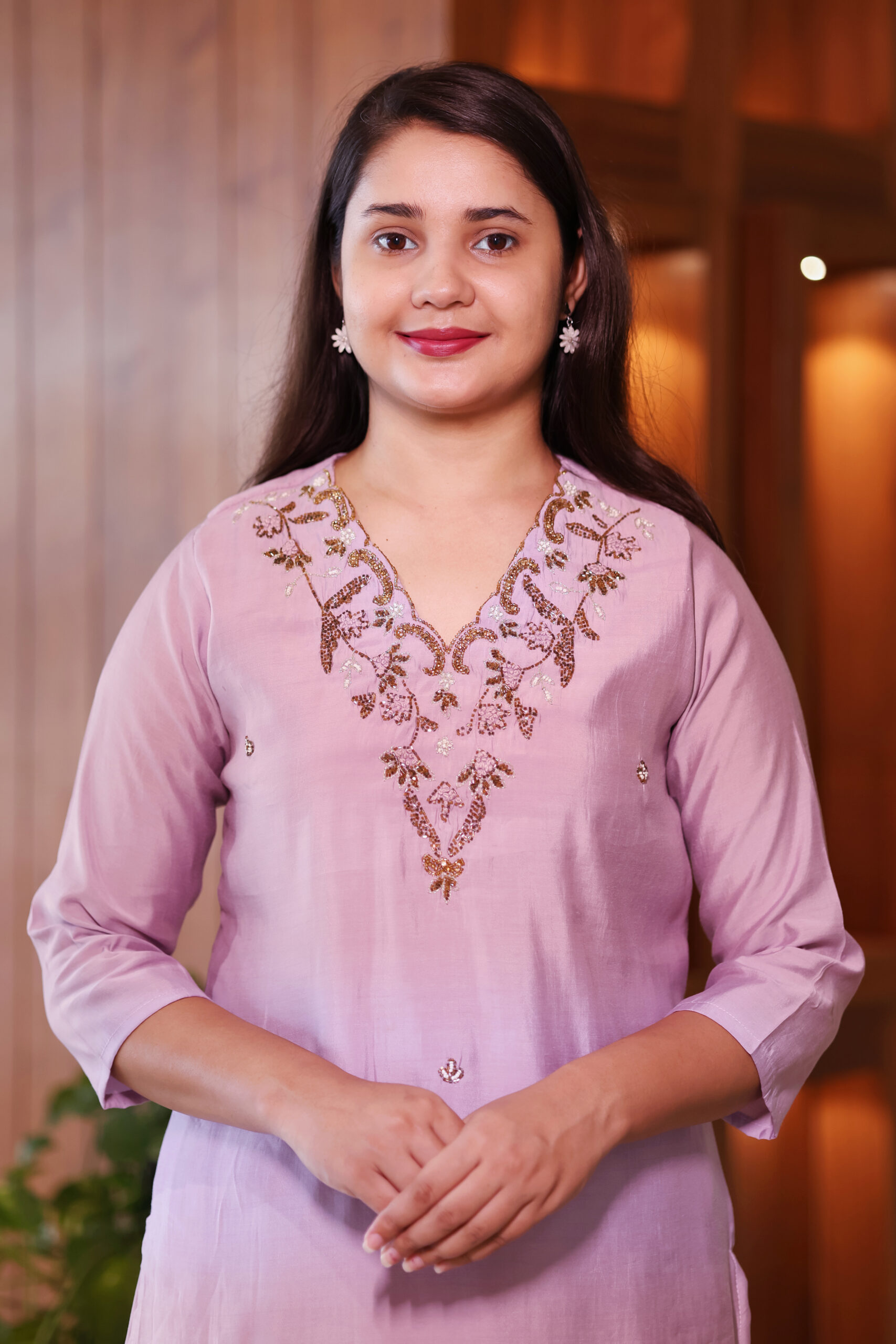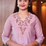 The solid kurta features delicate thread embroidery around the neckline and dainty mirror embellishments across the body, adding a touch of ethnic glamour.