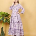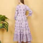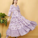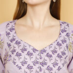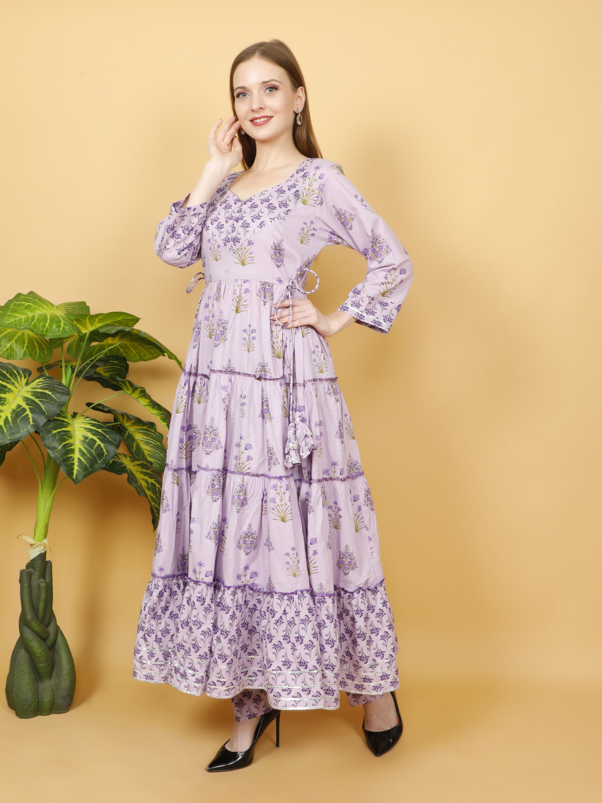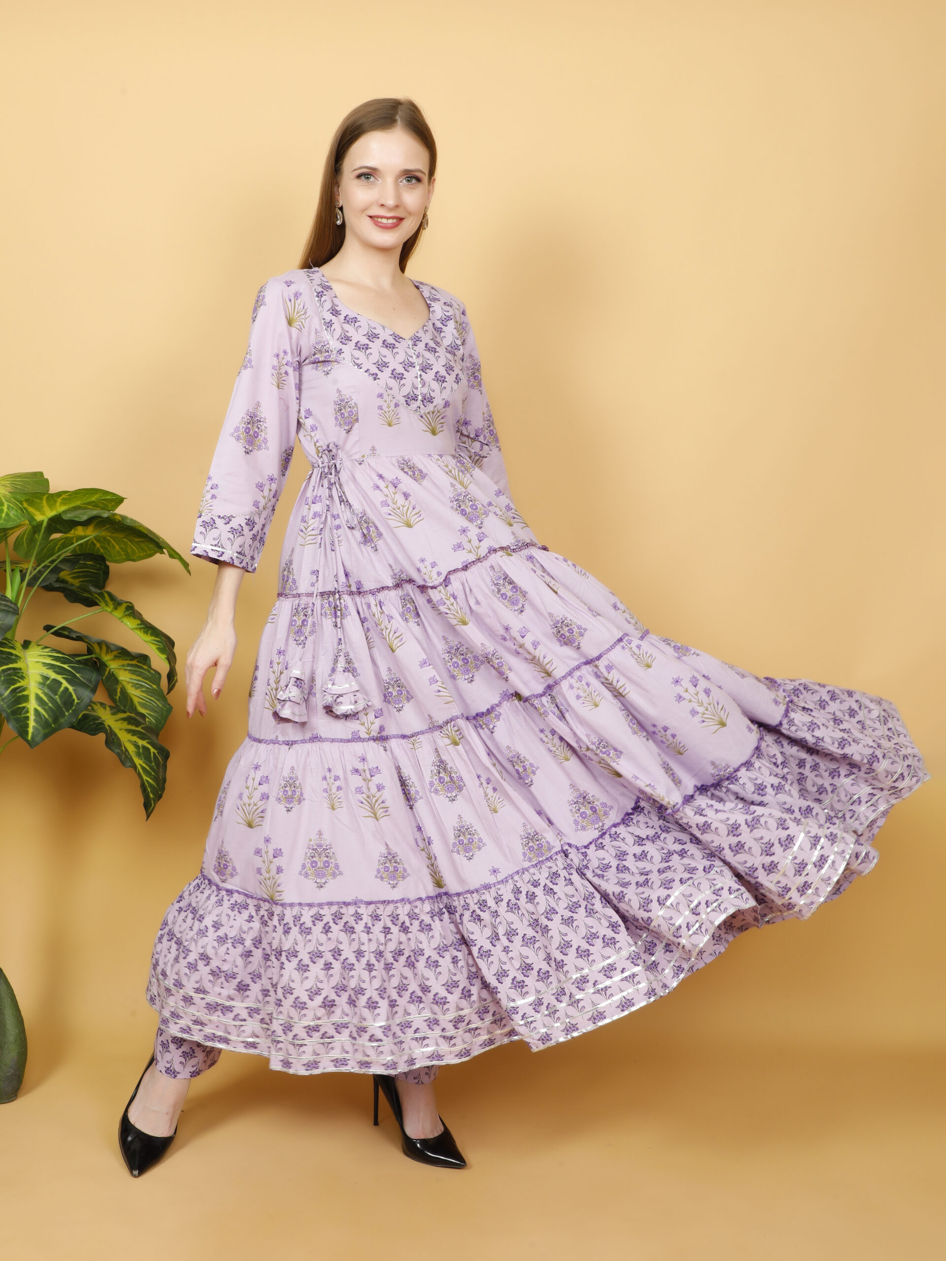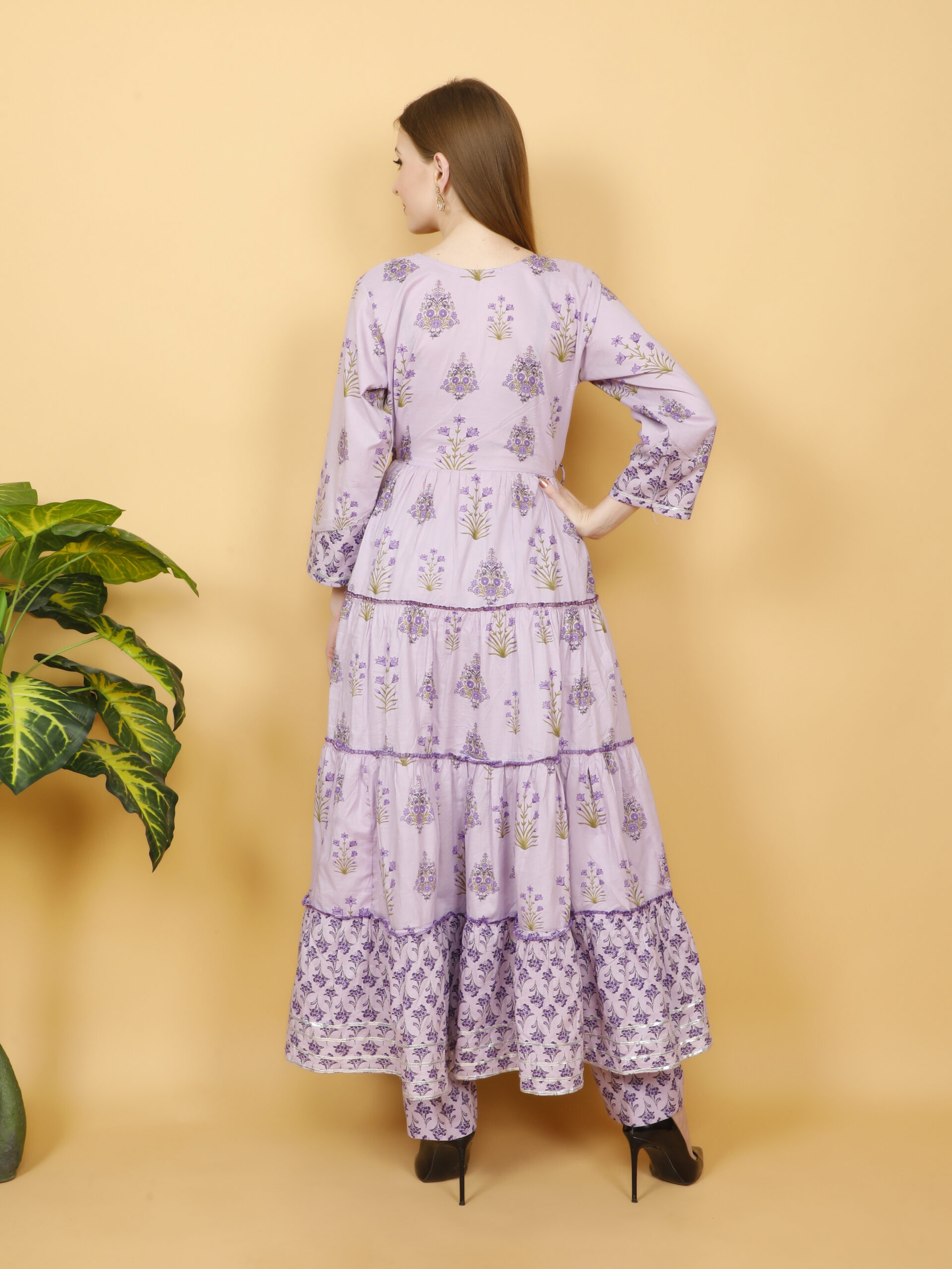 Step into timeless elegance with our Lavender Hand Block Printed Anarkali Kurta Set. Crafted from soft and breathable cotton fabric, this Anarkali kurta is adorned with exquisite floral block prints in rich purple tones on a pastel lavender base