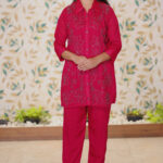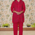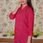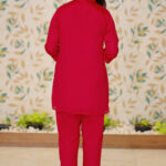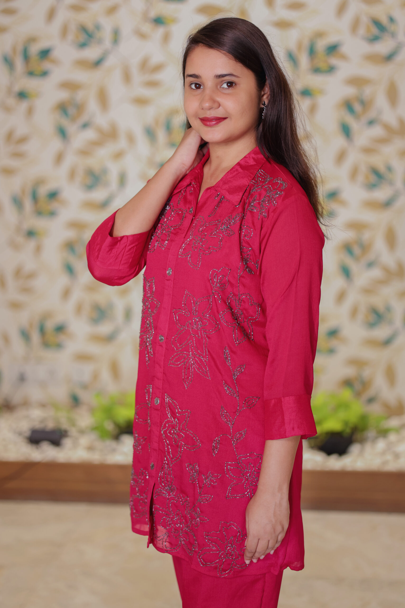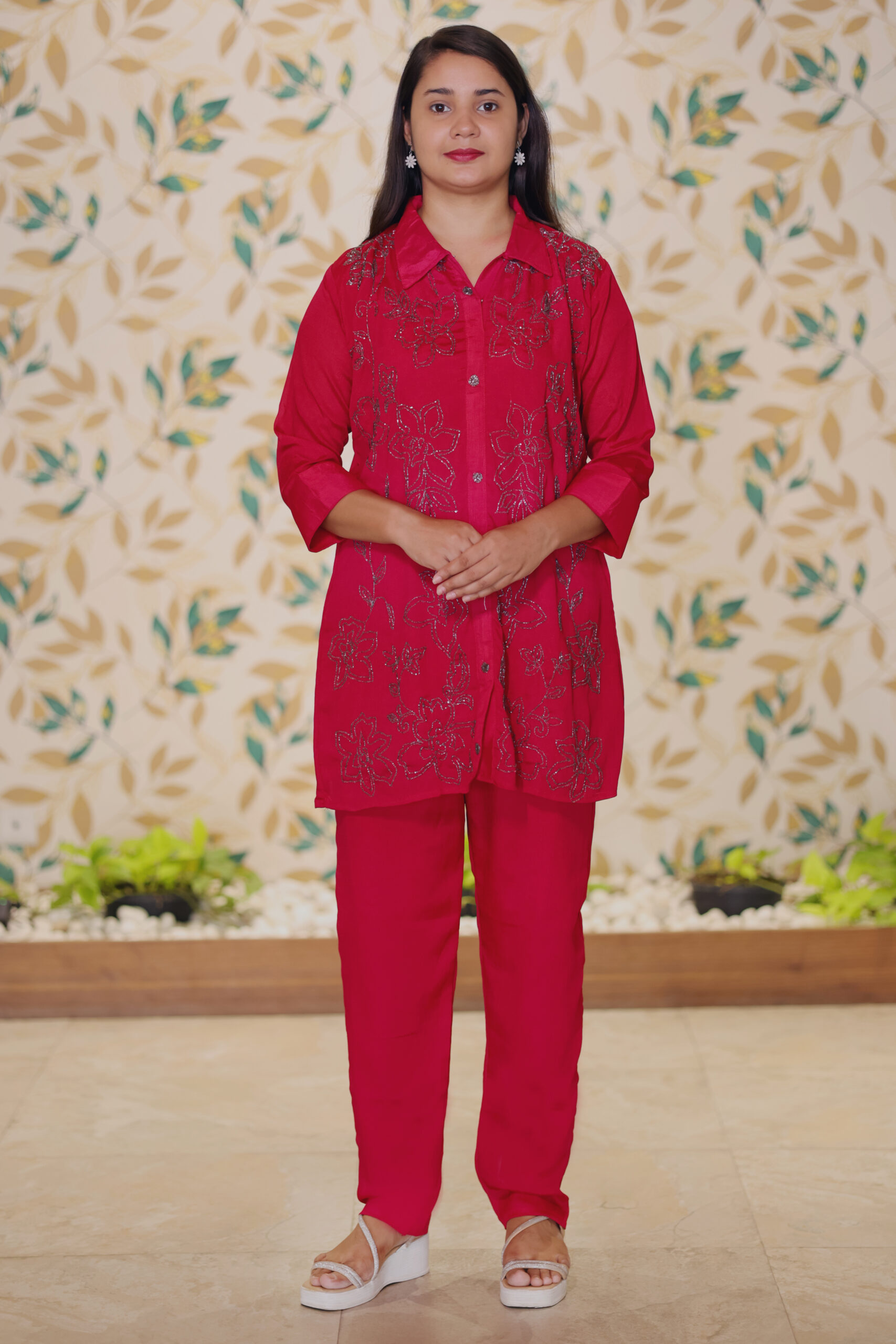 Add a splash of elegance and charm to your wardrobe with this beautifully tailored shirt-style co-ord set in a rich dark pink hue. Featuring floral sequin embroidery on the front and shoulders, the top showcases a classic shirt collar and button-down front—perfectly blending ethnic embroidery with a western silhouette. Paired with matching straight-fit trousers, this set is both graceful and effortlessly trendy.