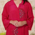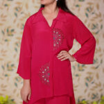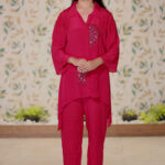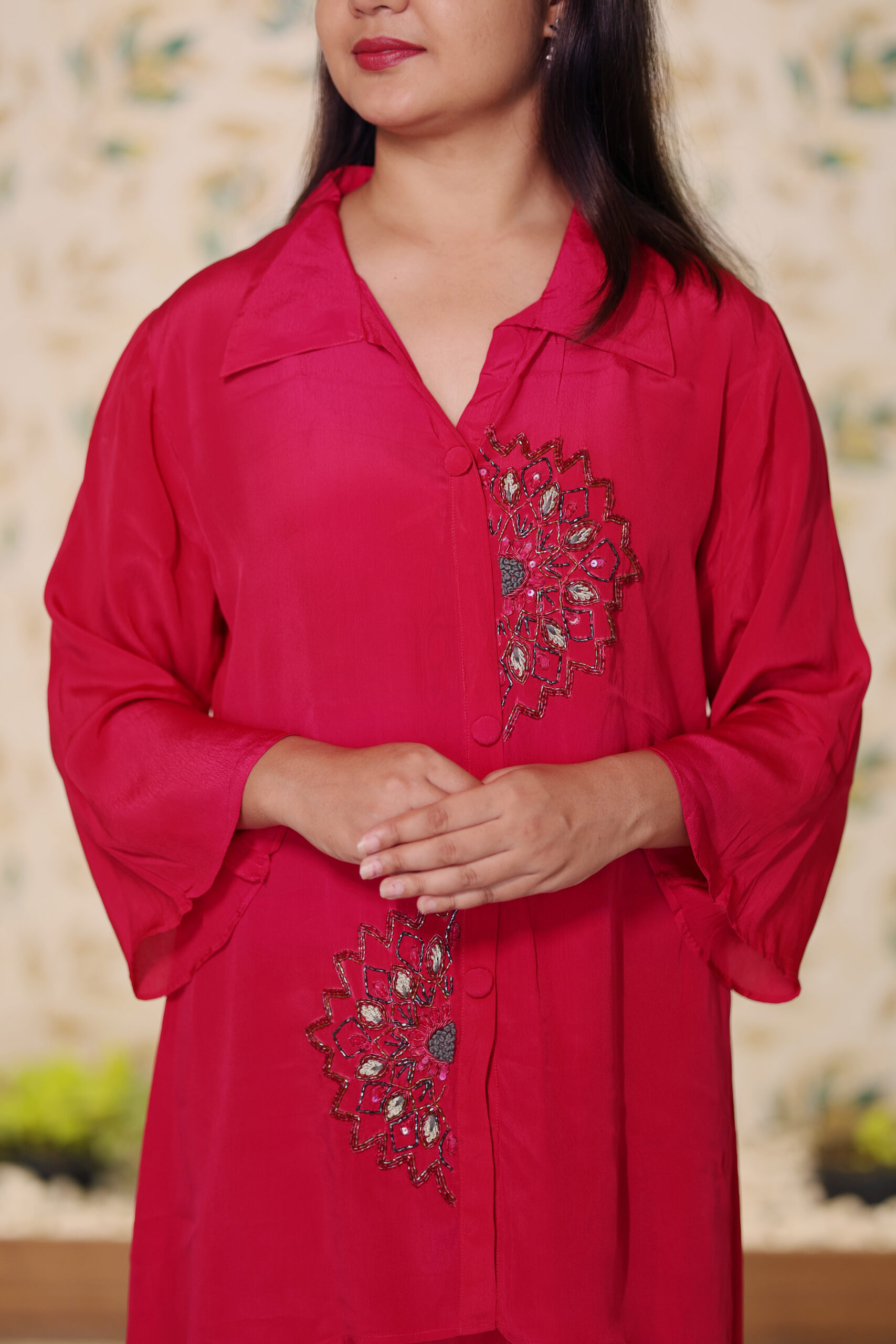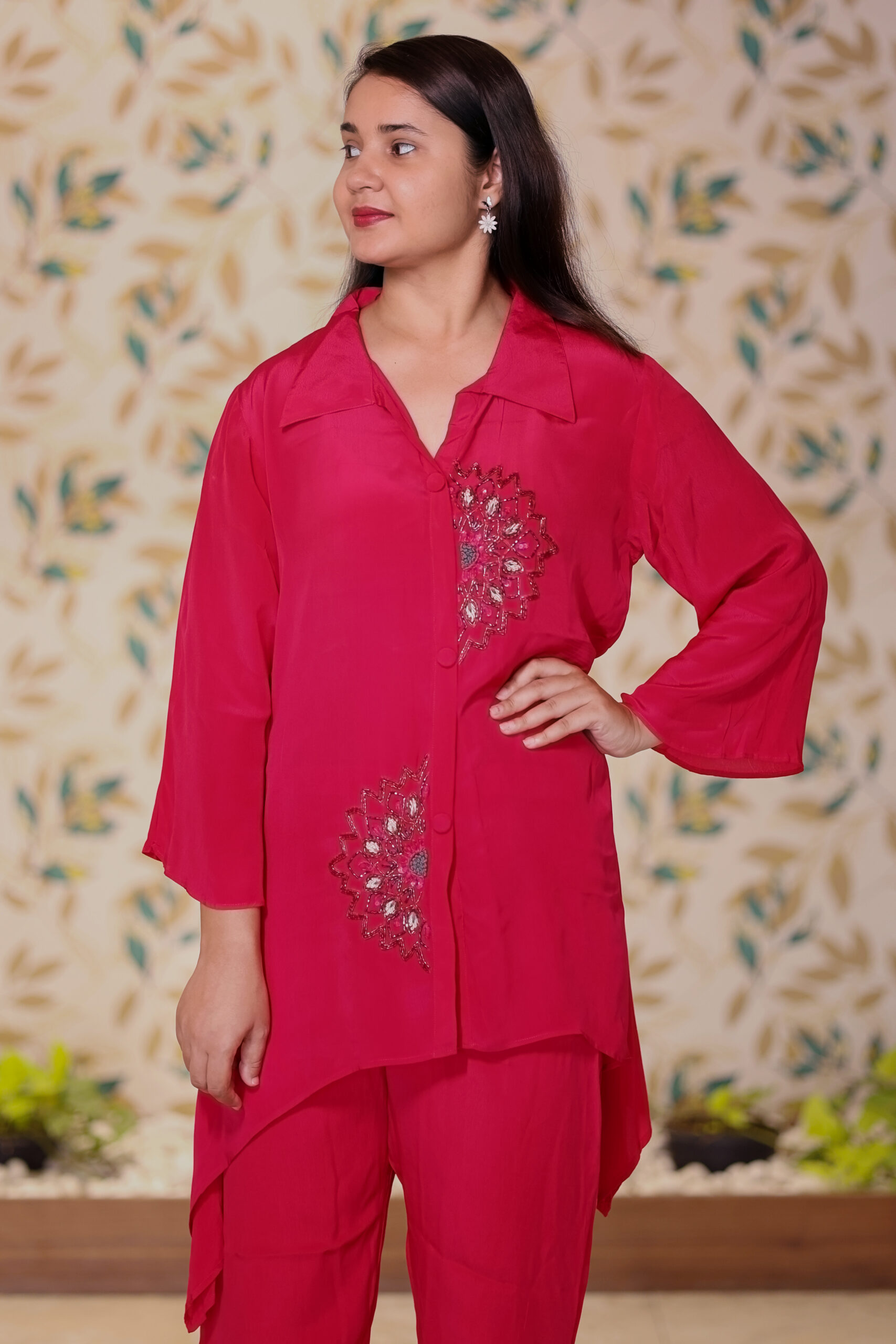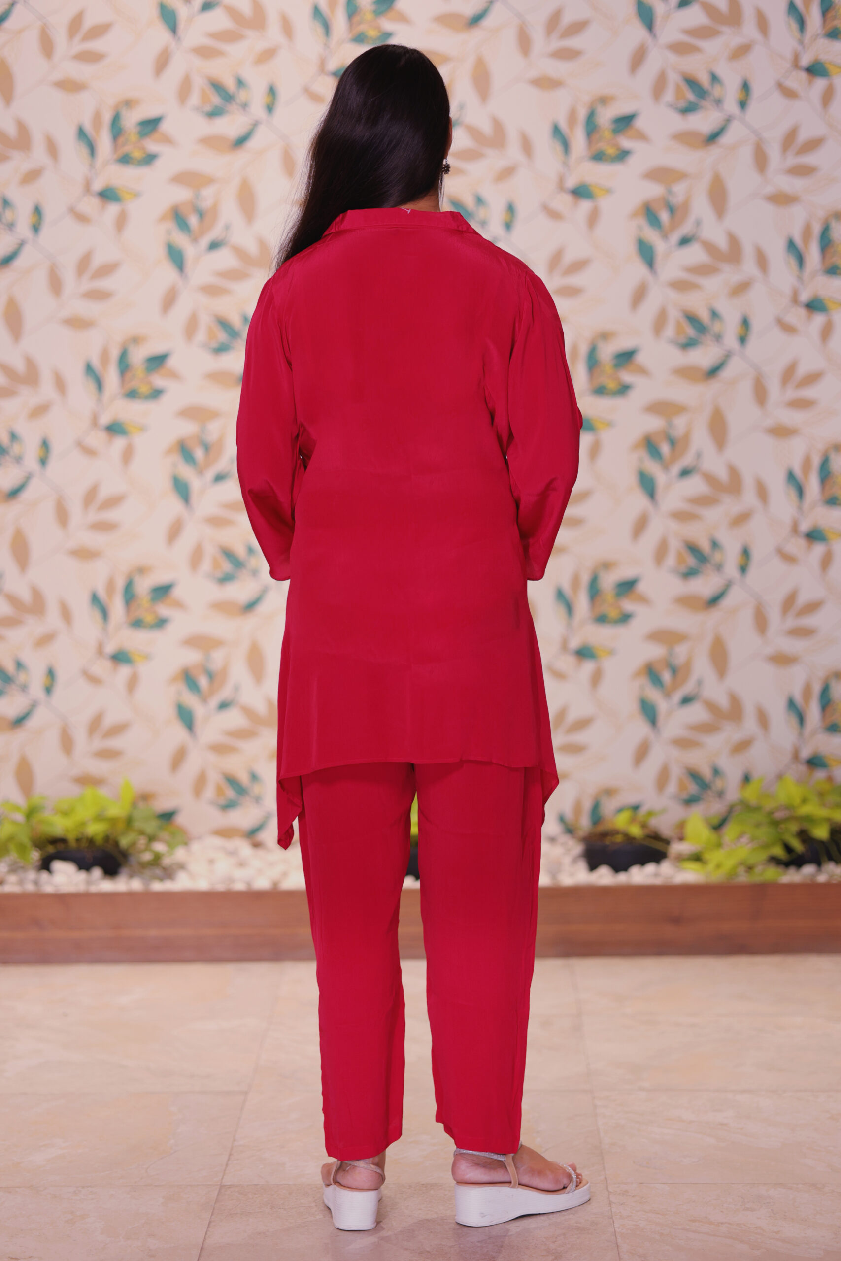 Unleash bold elegance with this chic red co-ord set, perfect for modern-day divas. Crafted in soft, breathable fabric, the set features a contemporary asymmetric top paired with matching straight-fit pants. Intricate sequin and thread embroidery on the front panel and hem add a luxe touch, making this ensemble ideal for brunches, office parties, and casual celebrations.
