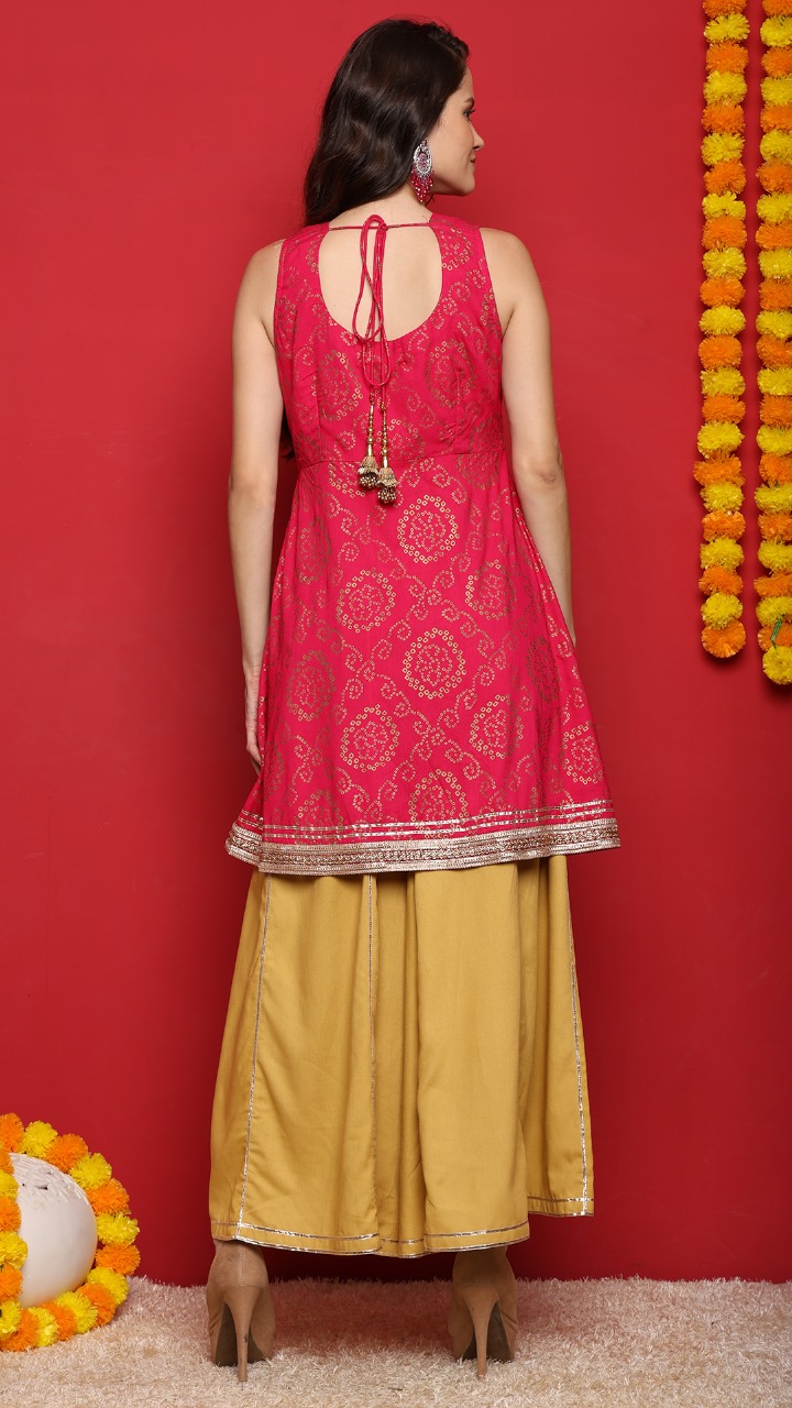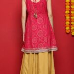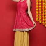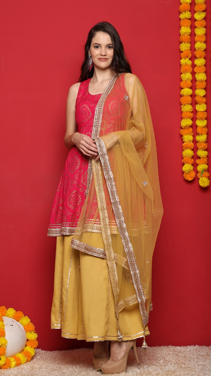 The pink Short kurti features intricate woven motifs that shine beautifully under festive lights. Paired with a mustard sharara enhanced with gold lace, the outfit strikes the perfect balance of elegance and comfort. The soft golden net dupatta adds a finishing touch of glamour.