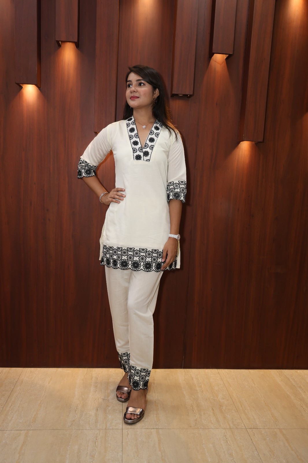Elevate your everyday style with this White & Black Embroidered Co-ord Set, crafted to give a chic Indo-fusion look. The black straight-fit kurta is beautifully highlighted with delicate floral embroidery on the neckline, sleeves, and hemline. Matching embroidered straight pants add a refined and coordinated Style .