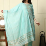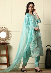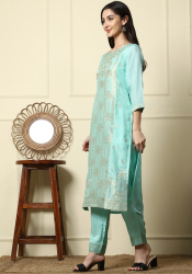 Women’s Aqua Blue Printed Suit Set with Dupatta