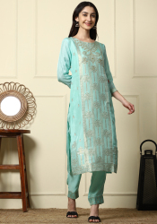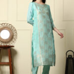 Refresh your festive wardrobe with this elegant Aqua Blue Suit Set. Designed with beautiful golden foil print over a soothing pastel base, the straight-fit kurti pairs perfectly with matching pants and a lightweight dupatta. Comfortable, breathable, and stylish — ideal for festive gatherings, office celebrations, kitty parties & special occasions.
