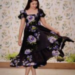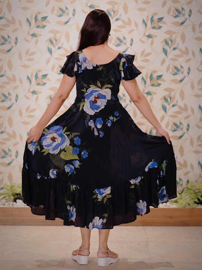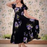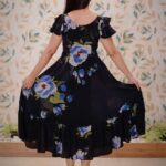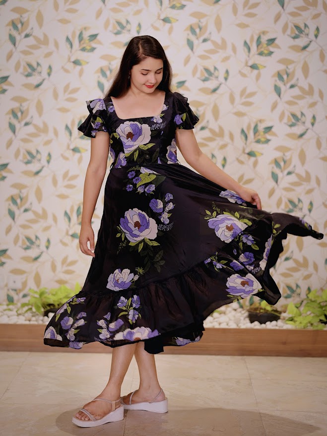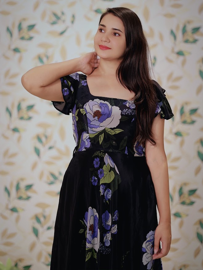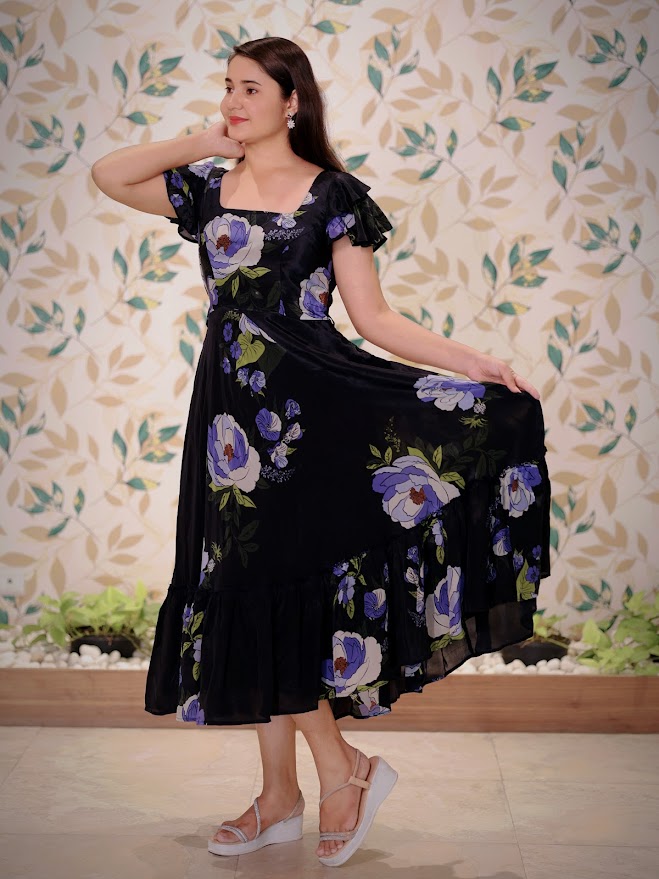 Step into effortless elegance with this Black Floral Midi Dress for Women, designed to keep you stylish and comfortable all day. Featuring a square neckline, soft ruffle sleeves, and a fit & flare silhouette, this dress enhances your natural shape while providing ease of movement.
