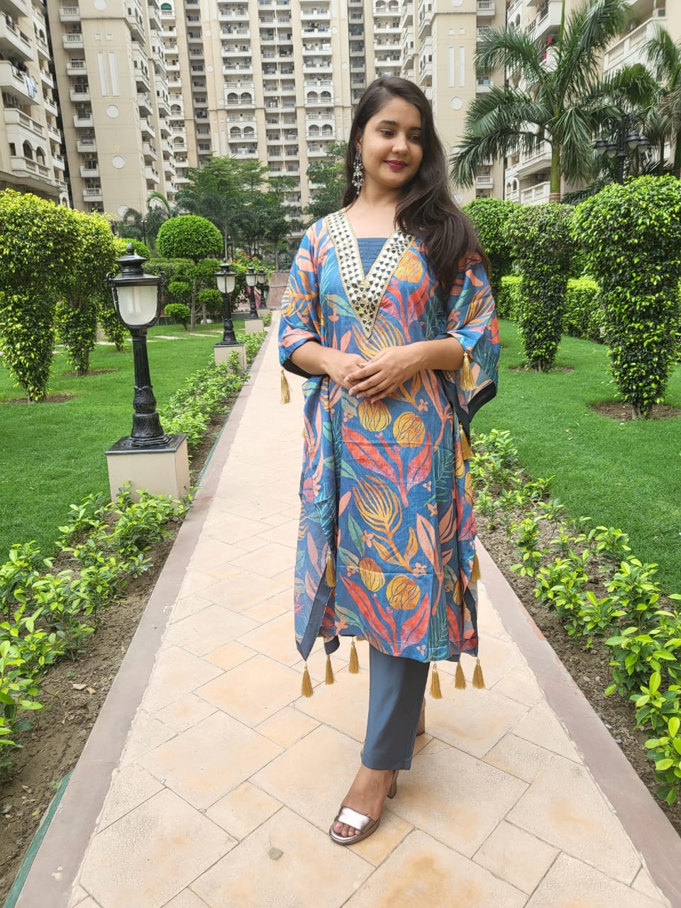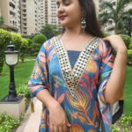 Designed in a free-flowing silhouette with eye-catching botanical prints, this outfit brings style & comfort together. The premium mirror-work V-neckline enhances the festive elegance, while the lightweight fabric keeps you comfortable throughout the day. Perfect for brunch outings, kitty parties, festive functions & holidays.