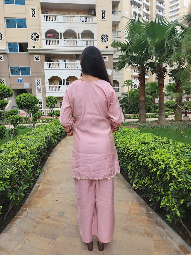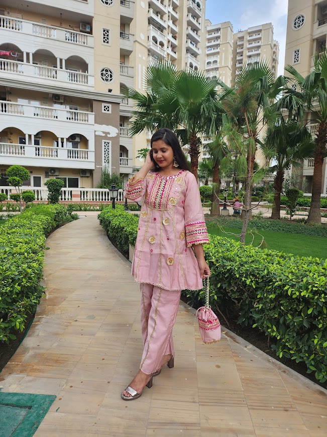 Women’s Pink Silk Embroidered Cord Set with Potli bag