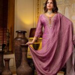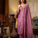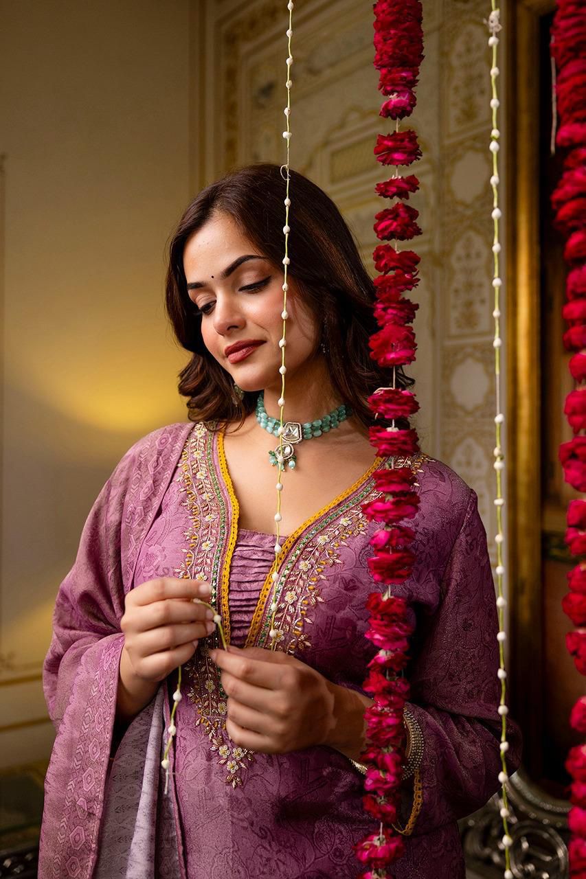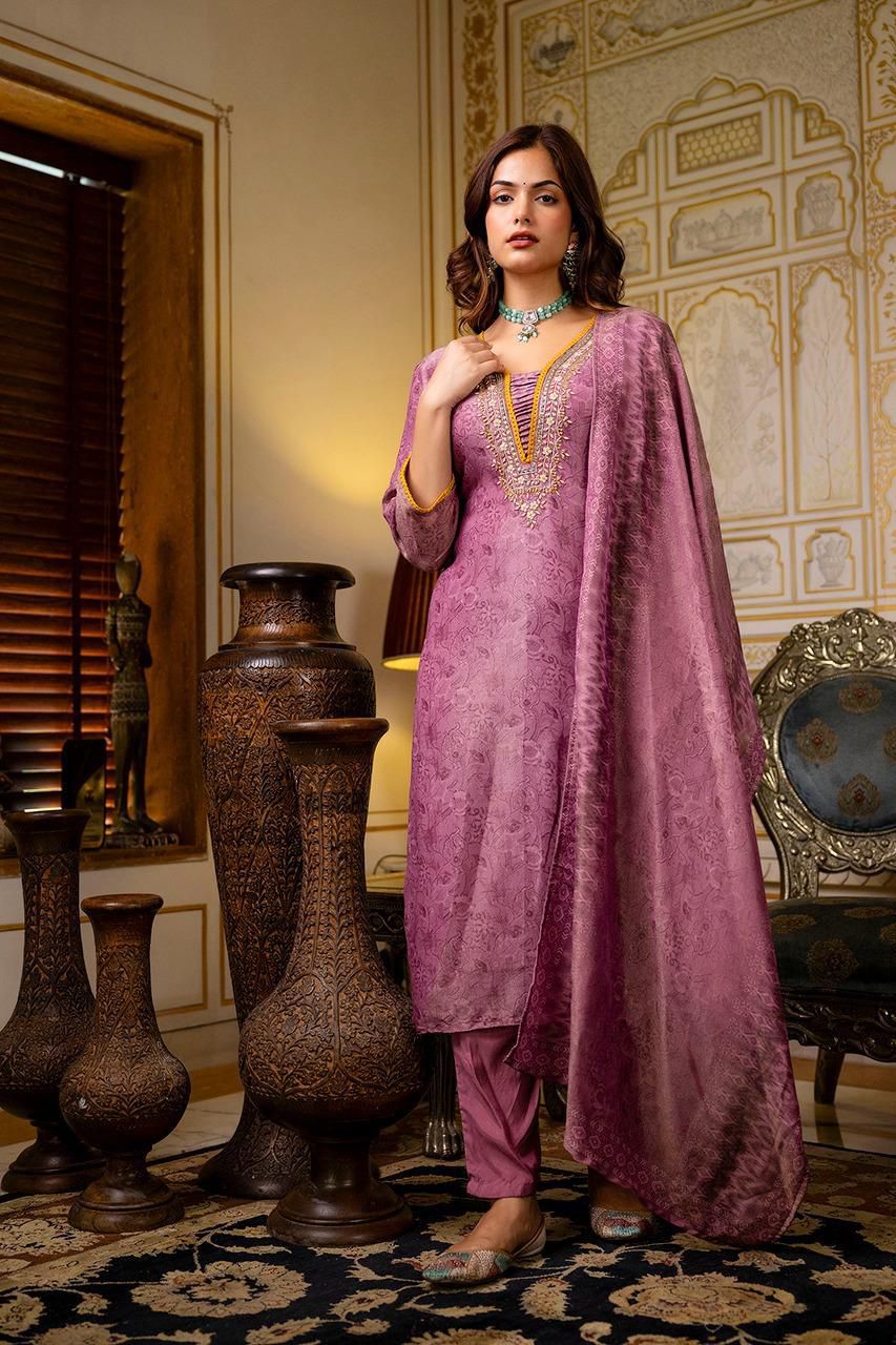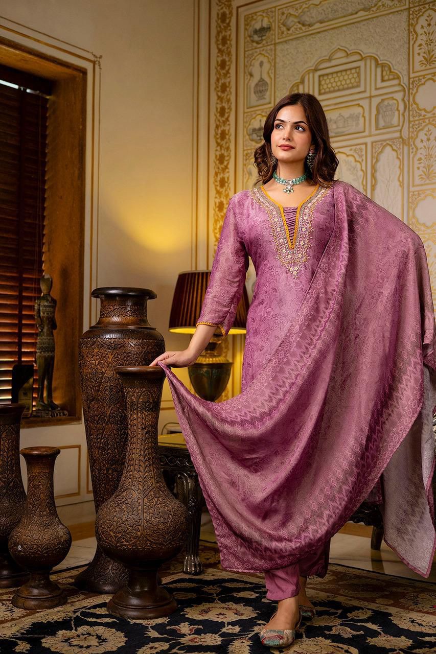 Elevate your festive wardrobe with this luxurious purple suit set crafted in a premium silk-blend fabric. The straight kurti features intricate thread and sequin embroidery around the neckline, with elegant detailing that adds royal charm. Soft printed dupatta and matching pants complete the rich ethnic look.