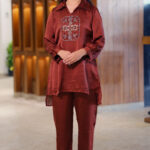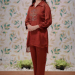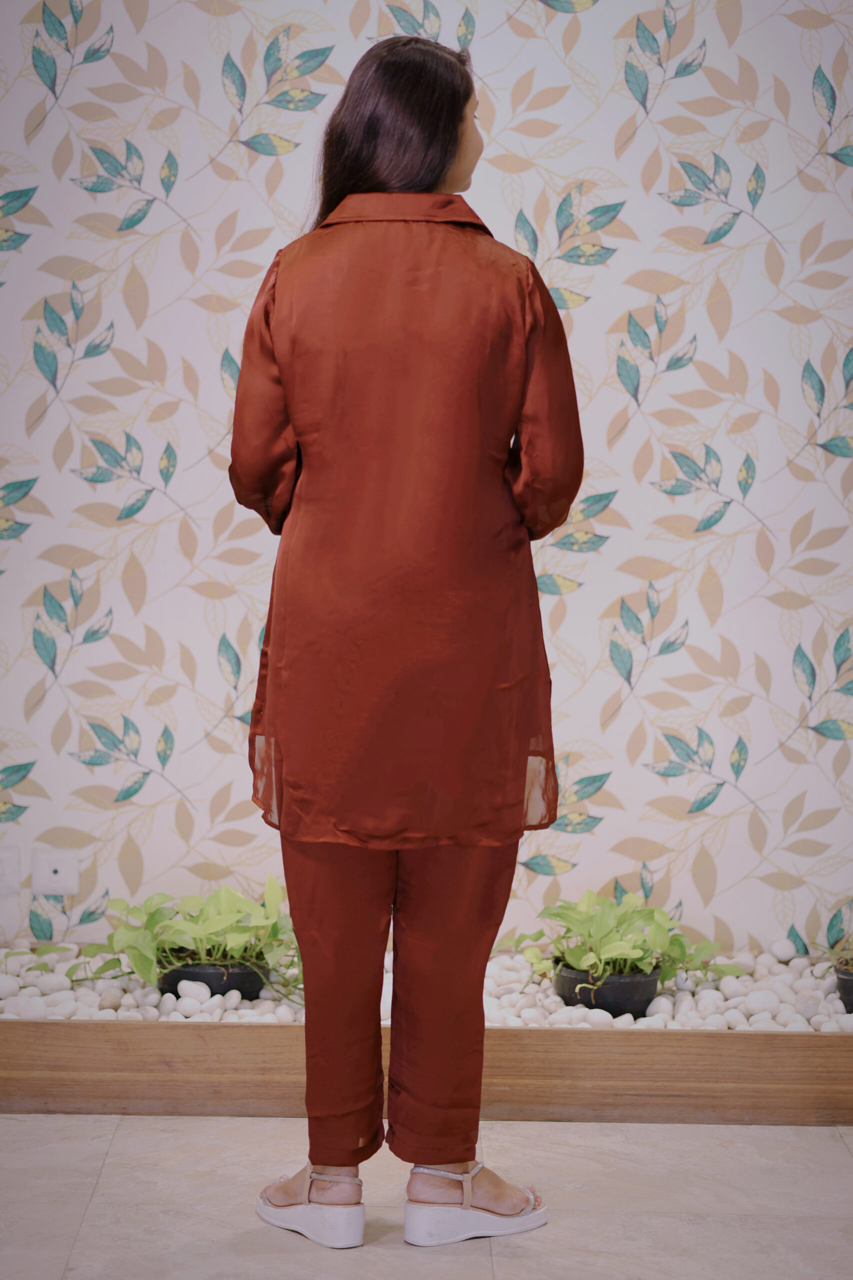 Upgrade your ethnic wardrobe with this elegant Rust Brown Co-ord Set that beautifully blends classic design with modern flair. The set features a straight-fit shirt-style kurta with intricate sequin and thread embroidery on the front.